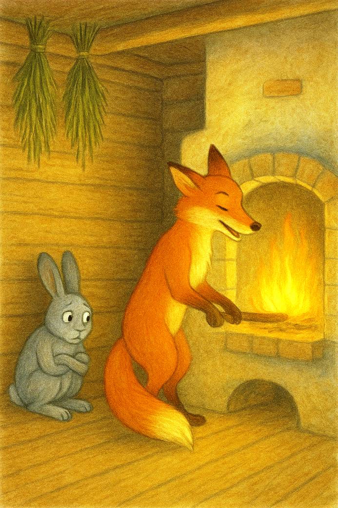– У тебя Лиса котел прохудился, вон вся вода вытекла. – Лиса кинулась к печке, глядь – все в порядке.