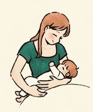 – Расположить ребёнка близко к себе. При этом голова малыша располагается чуть выше; попа и ножки чуть ниже, на одной линии (положение полулёжа).
