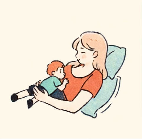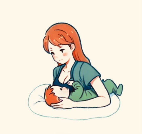 2. Лёжа на боку – мама лежит на боку, малыш вдоль тела мамы.