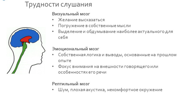 Следующий важный момент – слушание. Как слушать, чтобы действительно слышать, понимать, выделять главное и второстепенное, а потом еще написать собственный текст на основе услышанного? Предлагаю обратить внимание учеников на трудности, которые обычно испытывают люди при слушании. Я соотнесла их с тремя отделами мозга, о которых часто говорят в процессе коучинга, и поняла, что в этом случае каждый отдел по-своему «мешает» (Схема 2).