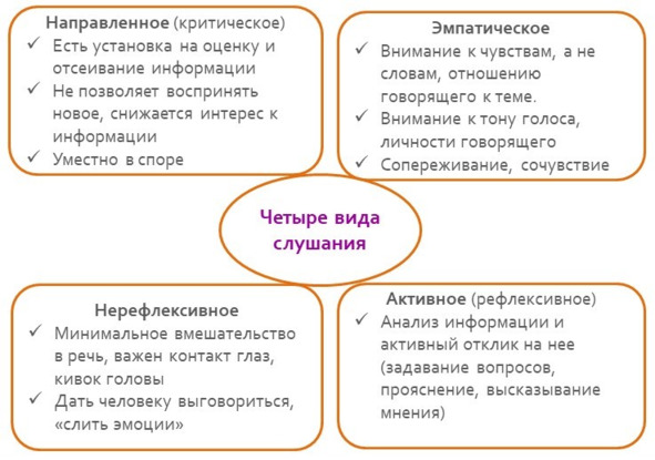 Немаловажным в коучинге является умение слушать клиента, я тоже обратилась к различным видам слушания, которые выделяют в психологии, чтобы картинка была наиболее полной (см. Схему 2):