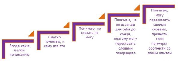 Второй уровень по пирамиде – действия. Что надо будет делать на изложении? Слушать, выделять главное и второстепенное и писать. А что все это значит с точки зрения эффективной работы над изложением: как надо слушать, как надо писать? Здесь полезно рассмотреть так называемую лестницу компетенций, которую я предлагаю в виде лестницы понимания (см. Схему 1):