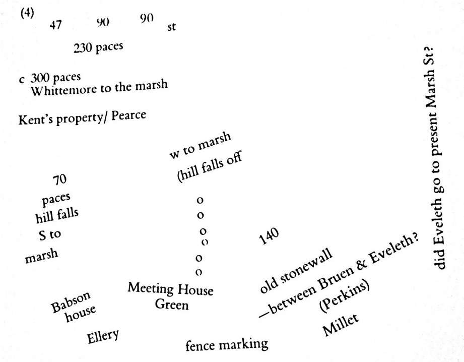 125 paces Grove Streetfr E end of Oak Grove cemeteryto major turn NW ofroadthis line goes finally straightfr Wallis property directto White (as of 1707/8)[20]Однако затем текст поэмы начинает имитировать карту графически: