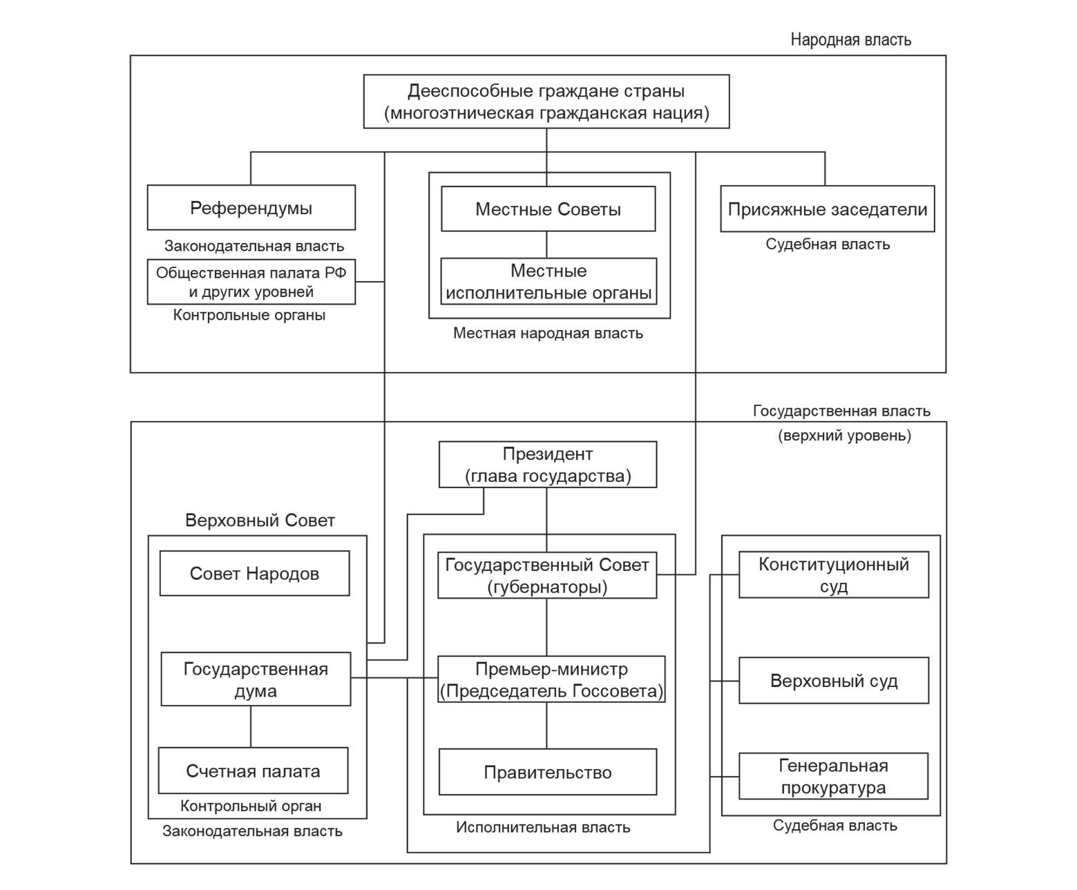 Верховный Совет состоит из двух палат: Совета Народов и Государственной Думы. Совет Народов формируется из представителей всех народов России и представляет их национальные интересы. Государственная Дума формируется по территориальному принципу и состоит из беспартийных представителей (для последовательного проведения принципа, согласно которому идеологией государства не может быть идеология какой-либо партии или группы).
