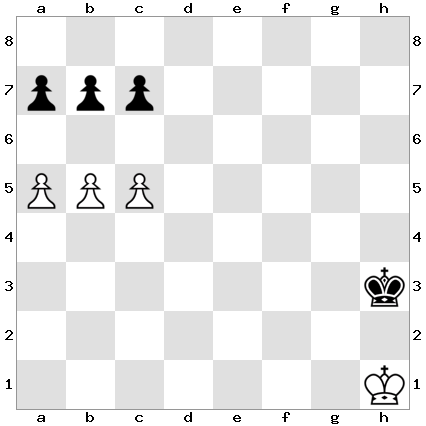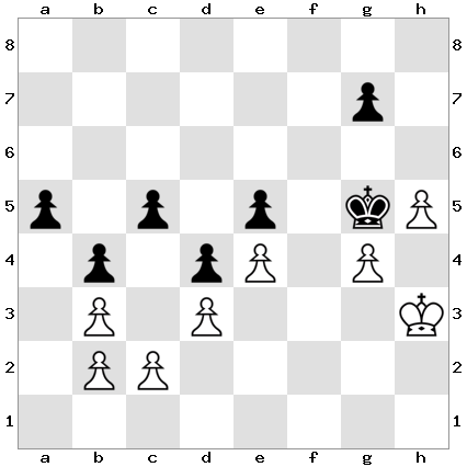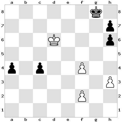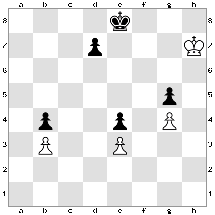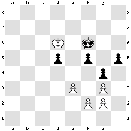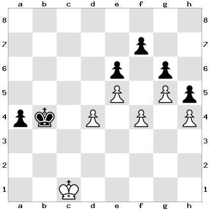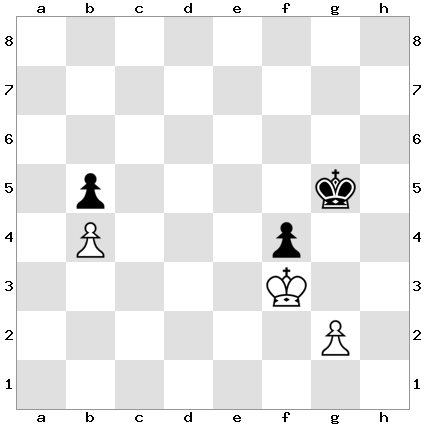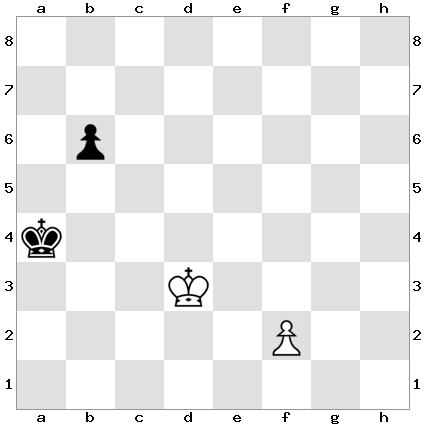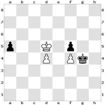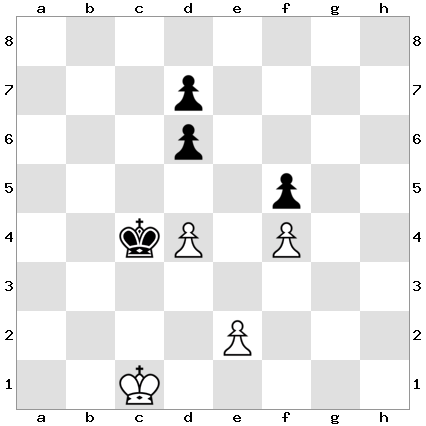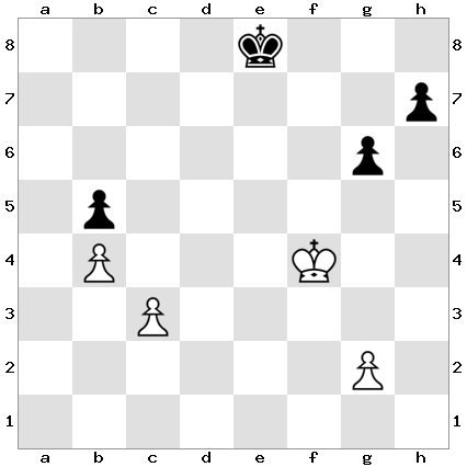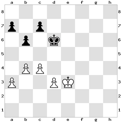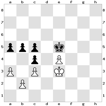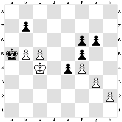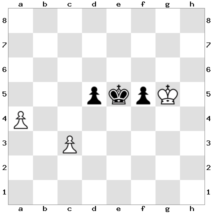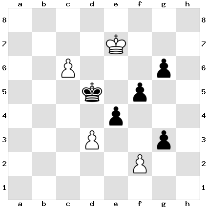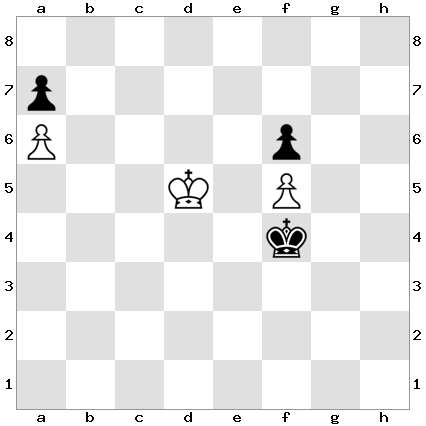 1. Крf3 b4 2. Крe3 a4 3. Крf3 bc 4. bc Кре6 (у черных иссякли ходы пешками) 5. Крf4 Крf6 6. е5+ Кре6 7. Кре4 Кре7 8. Крd5 уничтожая пешки черных и выигрывая партию