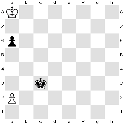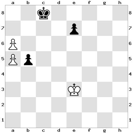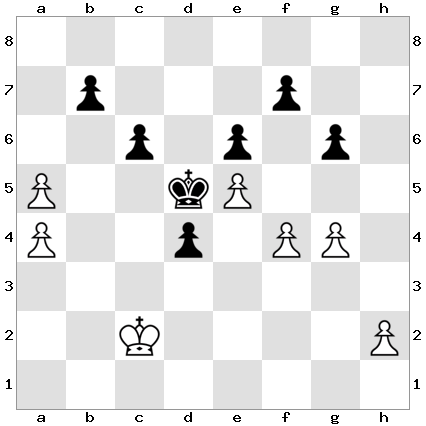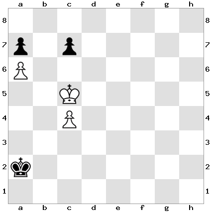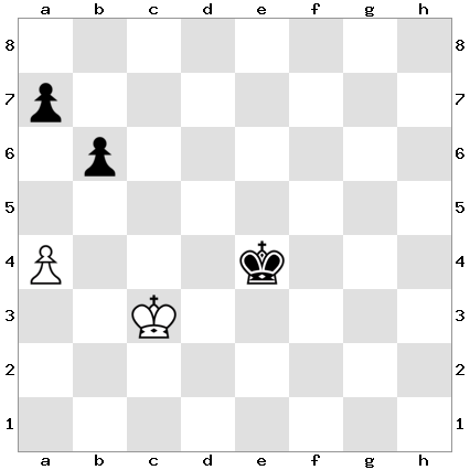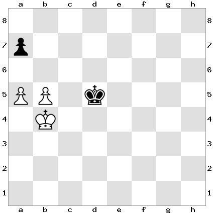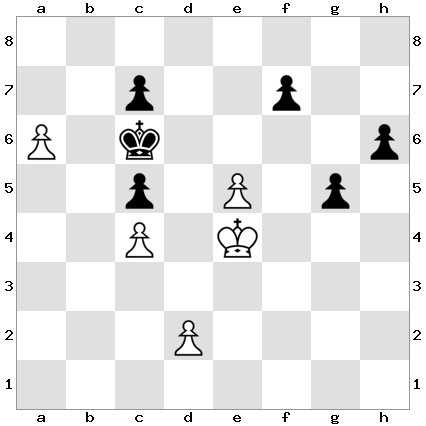 1. d4 a5 2. ba ba 3. Кре4 Кре6 4. d5+ Крd6 5. Крd4 Крd7 6. c5 Кре7 7. Крc4 Крd7 8. Крb5 белые выигрывают пешку “a5” и с ней партию