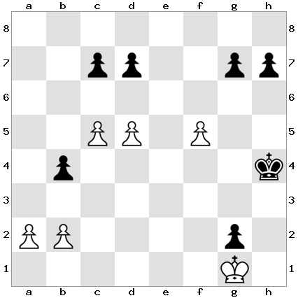 1…с4! 2. bc (2. dc a4! 3. ba b3, 4. cb d3 и черные выигрывают) 2…a4 2. c5 a3 4. ba 4…ba 5. c6 a2 6. c7 a1Ф 7. c8Ф Фf1+ 8. Крg3 Фf4+ 9. Крh3 Фf3+ 10. Крh2 Фf2+ 11. Крh3 11… Фh4+ 12. Крg2 Фg4+ 13. Фg4 Крg4, выигрывая пешку “h5” и партию