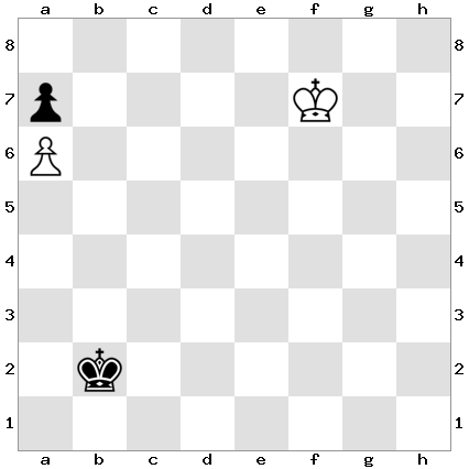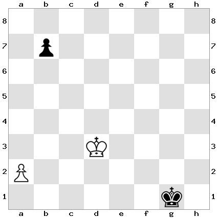 Преимущество в пространстве и далеко продвинутая пешка “a6”должны обеспечить белым победу. Их задача сводится к уничтожению черной пешки “a7” и проведении своей пешки “a6” в ферзи. Но эта задача осложнена тем, что, черные могут осуществить “зажим” белого короля на поле “a7”. Поэтому, маневрируя своим королем, белые должны уничтожить неприятельскую пешку “a7’ и успеть занять одно из ее критических полей.