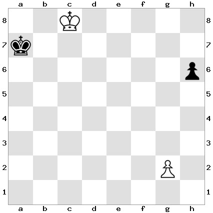 1. Крd7? Крb6 2. Кре6 Крс5 3. Крf5 Крd4 4. Крg6 Кре4! 5. Крh6 Крf4. Ничья. Правильно 1. Крс7! Кра6 2. Крс6 Кра5 3. Крс5 Кра4 4. Крс4 Кра3 5. Крс3 Кра2 6. Крс2 6…Кра3! 7. g3!! Изумительный по красоте ход! (7. g4?? Крb4 8. Крd3 Крс5 9. Кре4 Крd6 10. Крf5 h5! ничья) 7…Крb4 8. Крd3 8…Крc5 9. Кре4 Крd6 10. Крf5 Крd5 11. g4! выигрыш
