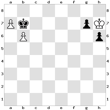 1. Крg6! (1. Крg7? h5! и черные выигрывают) 1…Кра8 2. Крf5 h5 3. Кре6 h4 4. Крd7 4…Крb7! 5. а8 Ф+! Кра8 6. Крc7 h3 7. b7+ и пешка проходит в ферзи выигрыш