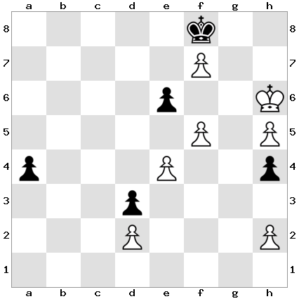 1. h4 Крe4 2. h5 gh 3. gh (отдаленная проходная) 3… f5 4. Крd2! c5 5. Крd3 (у черных нет хороших ходов. Цугцванг!) 5…f6 6. h6 Крg6 7. f5+! Крh6 8. fe Крg7 (вступая в квадрат пешки “e6”) 9. e7! Крf7 10. ef Кре8 11. Крс4 Крd7 (f7) 12. a6! ba 13. a5! ( опять цугцванг!) 13…Кре8 14. Крс5 d3! 15. Крd6! (15…Крf7 16. Крd7 d2 17. е8Ф+ выигрыш) 15…d2 16. Кре6 и мат следующим ходом