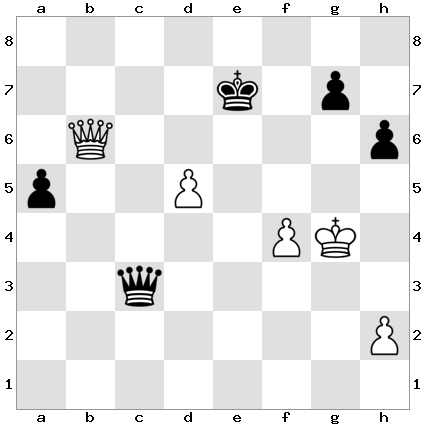 1…h5+! 2. Крh5 Фh3+ 3. Крg5 Фg2+ 4. Крf5 Фd5+ 5. Крg6 Фd6+ 6. Фd6 Крd6 7. f5 a4 8. Крg7 a3 9. f6 a2 10. f7 a1Ф+ 11. Крg8 Фg1+ и белые сдались
