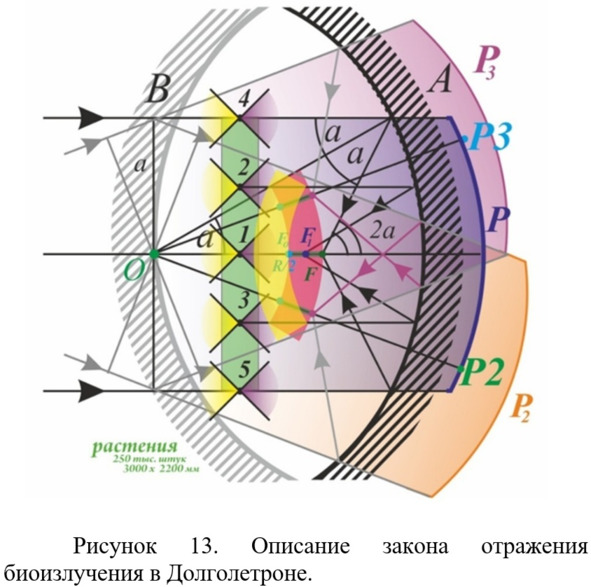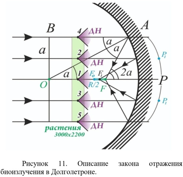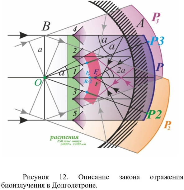 На рис. 11 мы добавили еще несколько элементов. Представим поток лучей параллельных оптической оси ОР. В подавляющем большинстве устройств, используемых в мире, такой поток приходит от бесконечно удаленного точечного источника (связь, радиолокация, оптика). Это классика. Однако, Долголетрон это не классика и такой же поток параллельных лучей формируется от стенда с растениями (показан зеленым цветом), который установлен в раскрыве сферического рефлектора, разумеется с некоторыми искажениями из-за близкого расстояния распределенного источника от рефлектора, которые приведут к определенному уменьшению качества концентрации, что даже полезно для Долголетронной технологии, где надо создать объемную фокальную зону. Все растения, имеющиеся на стенде в Большом Долголетроне (Рис. 6), которых примерно 250 тысяч, излучая параллельно оптической оси ОР сформируют фокальную линию FoF. На рис. 11 показан ход лучей от травинок, которые находятся в точках 1—5. При этом, для формирования этой фокальной линии будет работать часть сферы Р1 размером 3000х2200 мм (проекция размера стенда с растениями на сферу). Таким образом, будет 250 тыс. параллельных лучей от 250 тыс. травинок на участок сферы размером 3000х2200 мм. И ВСЕ эти лучи отразятся от сферы и сформируют фокальную линию FoF длиной 16 см!