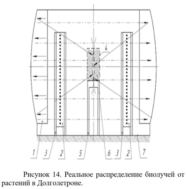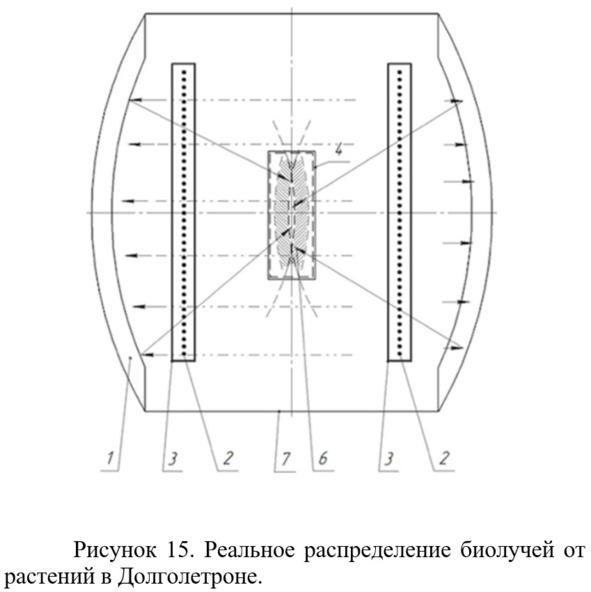 На рис. 18 показано схематическое изображение устройства из описания патента RU 2533058 (Комраков, 2012) с цилиндрическими рефлекторами. Долголетроны с цилиндрическими рефлекторами в вертикальной плоскости будут работать точно так же, как и со сферическими рефлекторами и рис. 10—13 полностью подходят и для цилиндрических рефлекторов. В горизонтальной плоскости фокальная зона будет формироваться за счет отражения излучения всех растений в этой плоскости. В горизонтальной плоскости эффективность цилиндрических рефлекторов будет в 2 раза меньше, поскольку там работает закон «угол падения равен углу отражения». Общая эффективность устройства с использованием цилиндрических рефлекторов будет составлять 75% от устройства с использованием сферических рефлекторов таких же размеров. При этом цилиндрическая фокальная зона будет даже несколько больше, чем длина цилиндрического рефлектора.