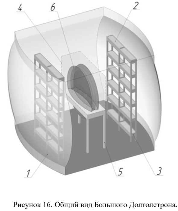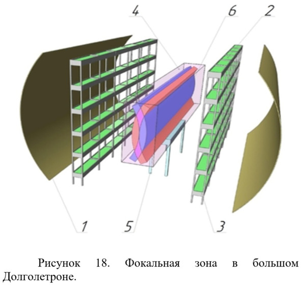 Следующие 3 рисунка из описания патента RU 2533058 (Комраков, 2012) показывают то, что получилось уже в Долголетроне ЕКОМ (вид сбоку, сверху и общий вид – рис. 14—16). На этих рисунках приняты следующие обозначения: 1 – сферический рефлектор, 2 – распределенный источник излучения, 3 – стенд для распределенного источника излучения, 4 – объект, 5 – средство для размещения объекта, 6 – фокальная зона, 7 – камера.