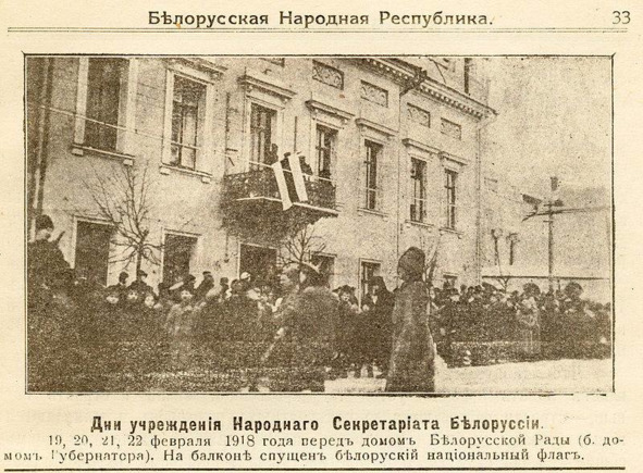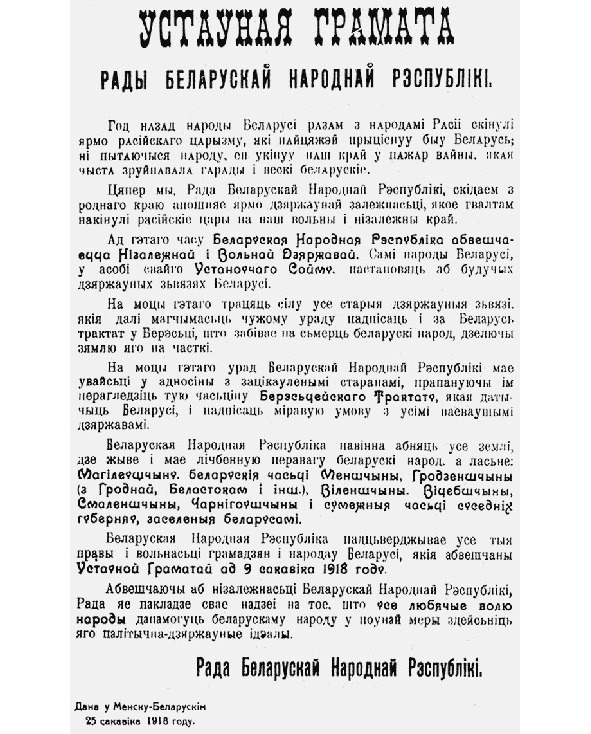 25 марта 3-й Уставной грамотой БНР объявлялась «независимым и свободным государством». 28 апреля 1918 года на заседании Народного секретариата были утверждены государственные символы Беларуси – бело-красно-белый флаг и герб «Погоня»».
