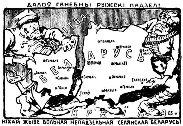 Рижский мирный договор 1921 года – договор между РСФСР, «от имени» Белорусской ССР и УССР, с одной стороны, и Польшей – с другой, подписанный 18 марта в Риге, завершил советско-польскую трехлетнюю войну. В Минских и Виленских газетах тех лет появились карикатуры на этот «мирный договор» с такими, например, подписями: «Долой позорный рижский раздел! Да здравствует, свободная, нераздельная, крестьянская Беларусь!». По этому договору вся Западная Беларусь – это современные Брестская, Гродненская и части Витебской и Минской областей были отданы Польше.