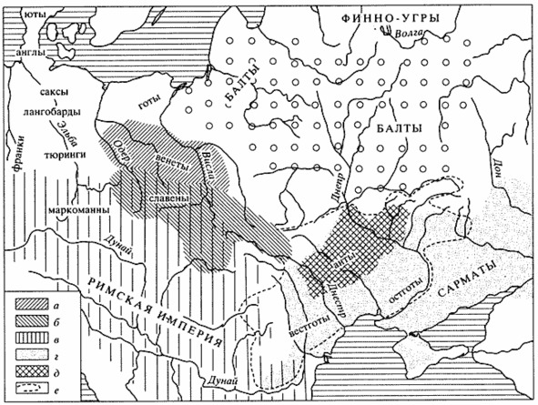 а – ареал северного варианта пшеворской культуры; б – южного варианта пшеворской культуры, сформировавшегося при участии кельтского субстрата; в – территория расселения кельтов в эпоху латена; г – территории расселения сарматских племен и поздне-скифских культур до расселения в Северном славян и готов; д – подольско-днепровский вариант черняховской культуры; е – общая граница ареала черняховской культуры