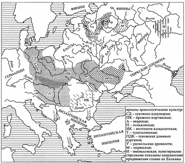 «Расселение славян на широкой территории привело к дальнейшей культурной и диалектной дифференциации. В южной части ареала пшеворской культуры, там, где в этногенезе славян участвовал кельтский субстрат, складывается пражско-корчакская культура. Начиная с рубежа V – VI вв. ее носители заселяют бассейн верхней и средней Эльбы на западе, Волынь и Припятское Полесье на востоке…»