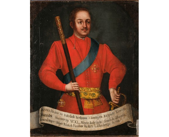 Еще один персонаж, который выделяется из всех, – единственный, который смотрит не на Богоматерь, а прямо на зрителя, стоит в левом углу иконы в короне, напоминающей великокняжескую. Он одет в типичный шляхетский длинный красный жупан, на котором орденская лента Белого Орла, знак Белого Орла прикреплен на груди, и в руках гетманская булава. Беларуский исследователь Юрий Пискун первым предположил, что это Игнатий Завиша – представитель знатного шляхетского рода, маршалок ВКЛ. Недалеко от Молодечно, откуда родом икона, в Лядах, Завиша (на иконе – цифра 1) основал монастырь.