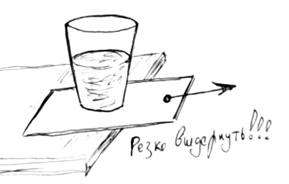 Тогда поставьте стакан воды на лист бумаги и резко выдерните бумагу из-под стакана. Стакан останется на месте, а закон сработает.
