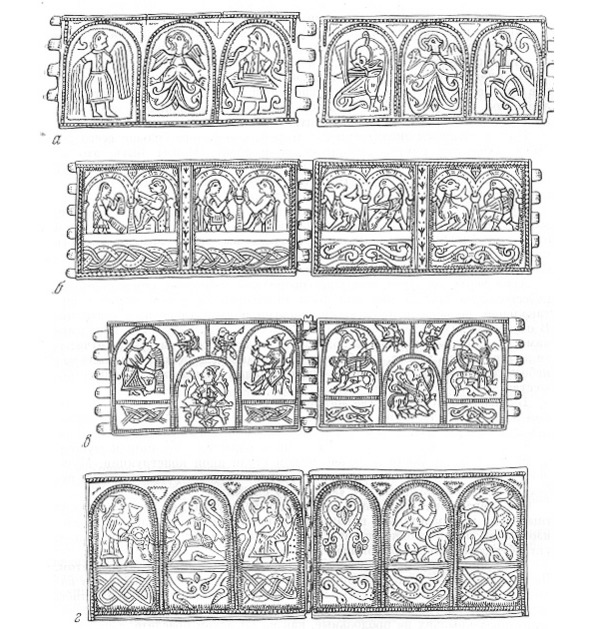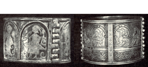 Орнаменты, сопровождаемые сюжетными изображениями, сохранились на ритуальных браслетах XII – XIII веков. Эти браслеты хорошо известны, они обнаружены по всей полосе походов Батыя от Рязани до Твери и от Владимира до Галицкой земли, то есть везде, где были зарыты клады 1227 – 1241 гг.