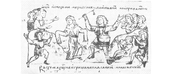 «Игрища между селы». Ритуальный танец русалий в русской деревне XI – XII вв. Миниатюра Радзивиловской летописи.