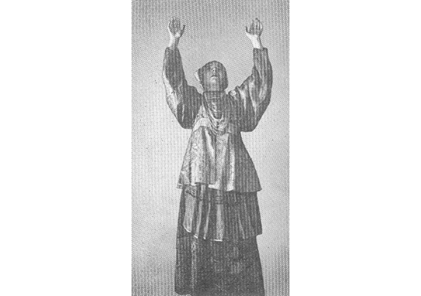 В центре трехчастной композиции изображение женской фигурки с опущенными руками и «лучиками» на голове. По сторонам от нее в архитектурных постройках изображение двух женских фигур с опущенными руками и полуфигур с поднятыми руками между ними. (Изобразительные мотивы в русской народной вышивке. – М, 1980, №154)