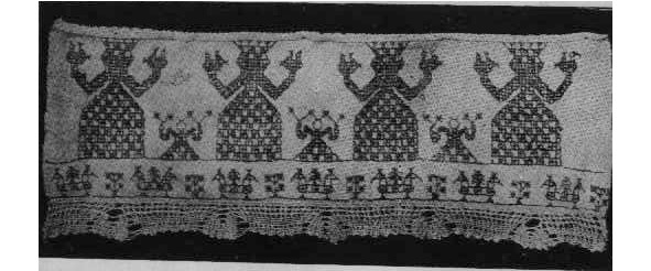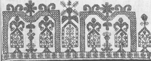Полоса орнамента из чередующихся изображений женских фигур с растениями в поднятых руках и стилизированных деревьев. (Изобразительные мотивы в русской народной вышивке. – М., 1980, №154)
