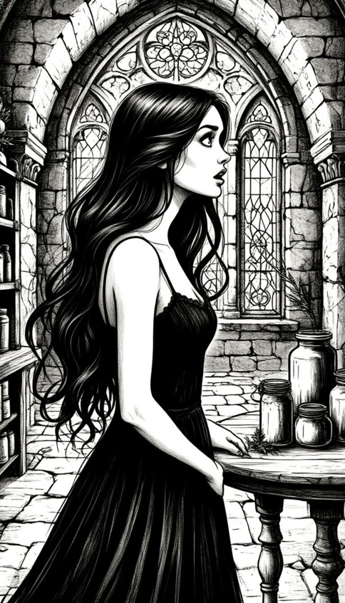 Комната была одновременно кухней, лабораторией и библиотекой. На массивном дубовом столе стояли склянки с жидкостями, мерцавшими всеми цветами радуги, тигли и ступки из черного обсидиана. Полки гнулись под тяжестью фолиантов в потрескавшихся кожаных переплетах с застежками в виде звериных когтей или символов, начертанных серебром.