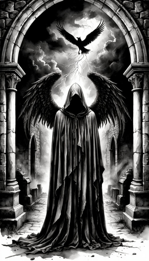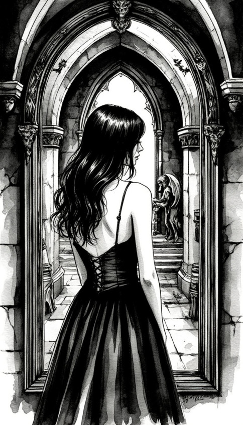 Вериника отпрянула от двери, сердце бешено колотилось. Она вернулась в свою комнату, осторожно раздвинула тяжелую штору и припала к окну. На площадке перед склепом, стоял высокий мужчина в черном, длинном плаще, его лицо скрывала тень капюшона. Рядом с ним бил копытом конь – угольно-черный, с развевающейся гривой, и глаза его пылали адским огнем. От могучих плеч коня отходили огромные, кожистые, перепончатые крылья. Они медленно вздымались и опадали.