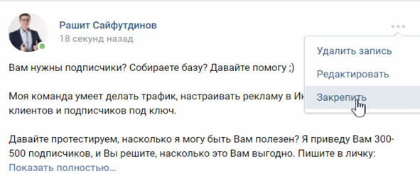 После того, как пост готов, наведите курсор в правый верхний угол, где расположены три точки. Появится меню, в нем жмите пункт «Закрепить».