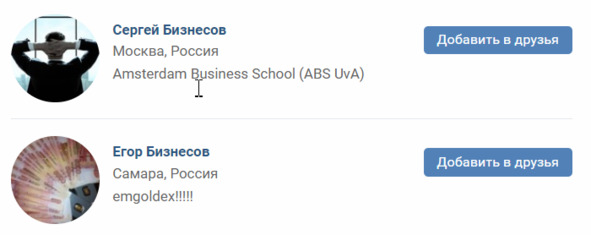 У вас будет длинный список из людей, которых ВК нашел по запросу, выбирайте тех, кто похож на бизнесменов, тренеров, инфобизнесменов. Рекомендую выбирать тех, у кого фотки на аватаре интересные: на сцене, в путешествии, с фотосессии или просто солидные и симпатичные фотографии, по которым видно, что это живой человек.