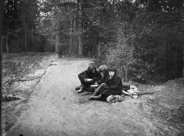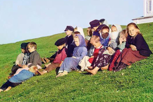 Peasant children on a hill in front of a snow-white temple. If the theory of reincarnation is correct, maybe they are you and me. Tver Province, 1909