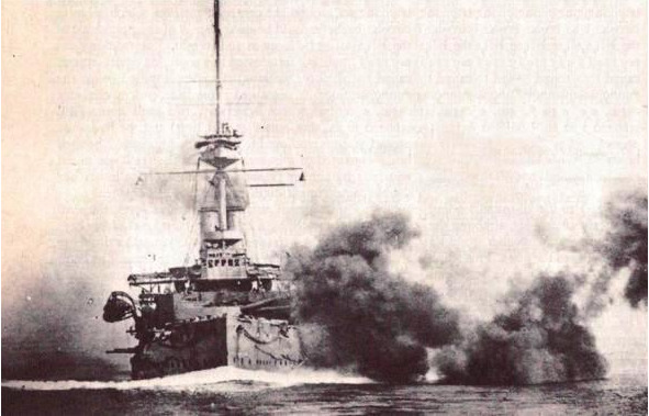 Immediately, seven British cruisers and an battleship rush to intercept German ships. The fire contact is established on December 8, 1914. Further, quite straightforwardly, the caliber of the guns affects the course of the battle. Size matters. At a distance of 12 kilometers 305 mm. British guns can confidently hit enemy ships, and 210 mm. guns of German cruisers – no. In the photo – the old, but formidable British battleship “Canopus”, the port guard, firing from 12-inch guns. Initially, the Germans expected to see at Port Stanley only this one, which has a rather weak booking