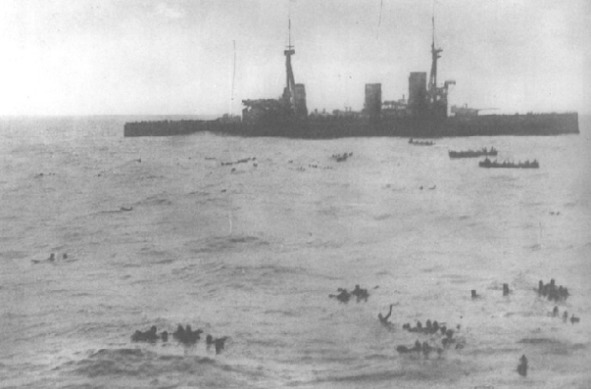 The Scharnhorst gets 40 hits and goes down. Of the 860 sailors, no one is saved. Two hours later, the same fate befalls Gneisenau. Survive 187 people. In addition, two light German cruisers and transports are killed in fire and water. One cruiser and hospital ship manages to escape. The total human losses of the Germans – 2110 people, 212 prisoners. The British squadron loses 6 sailors. Somewhat later, on August 28, 1915, in the battle near the island of Helgoland, the British allowed four German ships to the bottom and finally restore the reputation of their fleet.Photography – sailors from the Gneisenau are looking for salvation on the British cruiser Inflexible