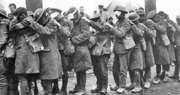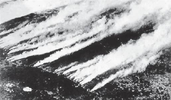 The first four months of the new, 1915, the parties to the conflict are gathering strength on the Western front. Then, for the first time in history, Germany applies the novelty of military thought – it releases one hundred and fifty gas cylinder batteries, 6 km from hundreds of cylinders. front line, 180 tons of toxic chlorine. The lungs of people caught in this fog are filled with a caustic mucous liquid. Following a cloud of yellow-green gas, in bandages soaked with protective compounds, German soldiers are marching. Such an apocalyptic picture discourages the British and the French not for long. Pull up reserves, already have some means of chemical protection. German troops stop, and the gap in the line of defense of the Entente is healed. As early as September 25, 1915, the Allied forces were conducting their “test” chemical attack. From 22 April to early May, a total of 10,000 Entente soldiers are injured by poisonous gases, 5,000 die. The photo is a snapshot from an airplane. German teams release chlorine from cylinders at the junction of British and French troops. The neighborhood of the city of Ypres, April 22, 1915