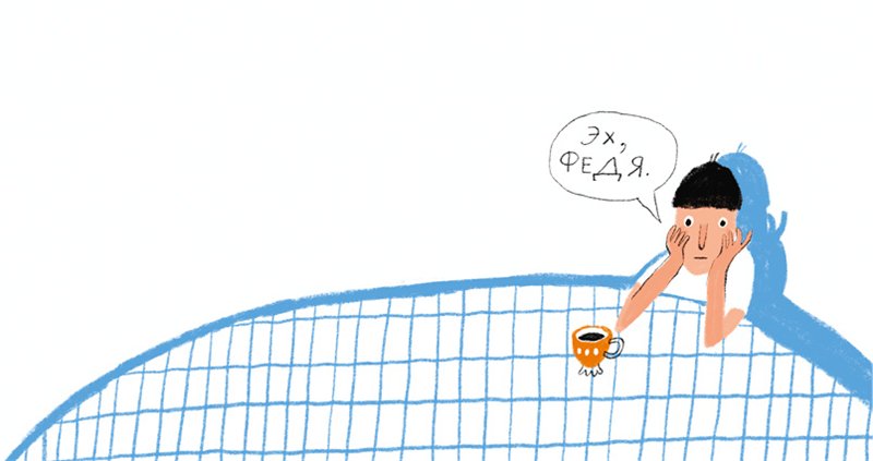 В нашей комнате Федя слушает свою музыку, но иногда заходит к папе, и они танцуют уже под папину. Смешнее всего у него получаются танцы на кровати родителей. Танцы с кувырками. Ещё он обожает, когда папа со всего размаху кидает его на кровать. Федя кричит: «Не надо! Не надо!» Но когда папа прекращает, просит ещё. И так каждый раз.