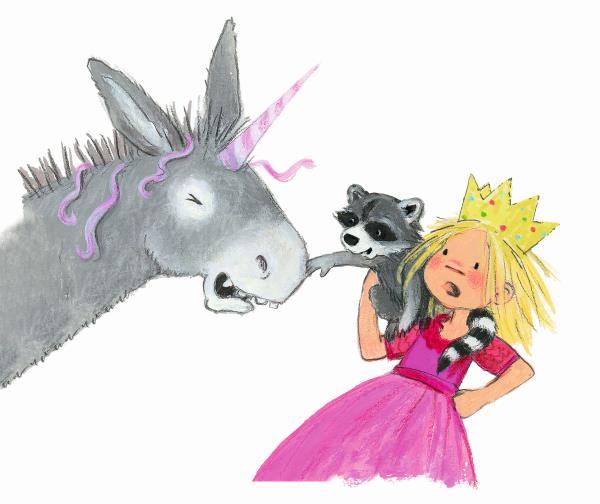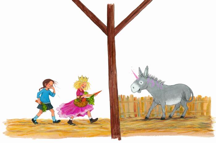 – Флаг нужно постирать, а то он стал таким же серым, как мой драгоценнейший хвост, и-а! – Ослик Единорог подтолкнул Розу головой. Очень осторожно, чтобы не уколоть её своим разноцветным, как карамелька, рогом. А потом объяснил, что написано на флаге: «Born to be a princess», по-русски значит «Рождена, чтобы стать принцессой, и-а!»