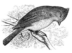 Habits. This very interesting species, which seems to combine within itself the principal characteristics of the Wren and the Titmouse, was first described by the late Dr. Gambel of Philadelphia. So far as is now known, it is confined to the coast country of California, from Fort Tejon to the shore and from San Diego to the Sacramento. Dr. Gambel’s attention was first directed to it by the continued sound of a loud, crepitant, grating scold which he was constantly hearing in fields of dead mustard-stalks and other similar places. He at last discovered it to be this species, which from its peculiar habits he called a Wren-tit. It kept close to the ground, was difficult to be seen, and eluded pursuit by diving into the thickest bunches of weeds, uttering, when approached, its peculiar grating wren-like notes. When quietly watched it could be seen to search for insects, climbing twigs and dry stalks sideways, jerking its long tail, or holding it erect in the manner of a wren, which, in this position, it very much resembles. He describes it as at times uttering a slow, monotonous singing note like a chick-a-dee, represented by pee-pee-pee-peep. At other times its song is a varied succession of whistling. In spring it was heard, in pairs, calling and answering, in a less solemn strain, and in a manner not unlike a sparrow, with a brief pit-pit-pit, ending with a prolonged trill. If disturbed, they at once resumed their usual scolding cries.
