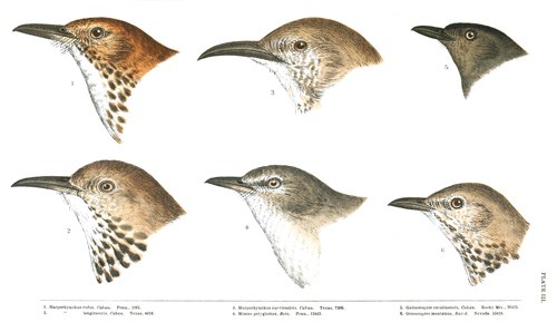 Birds of this section have a somewhat thrush-like appearance, but (except in Oreoscoptes) with longer, much more graduated, and broader tail; short concave wings, about equal to or shorter than the tail, usually lengthened, sometimes decurved bill without notch, and strongly marked scutellæ on the anterior face of the tarsus. The loral feathers are soft, and not ending in bristly points. The colors are dull shades of brown, gray, or plumbeous. Most of the species, in addition to a melodious native song, possess the power of imitating the notes of other birds; sometimes, as in the American Mocking Bird, to an eminent degree. All are peculiar to the New World, and the species are much less vagrant than those of the Turdinæ,—those of the United States scarcely going beyond its northern boundary; others, again, restricted to small islands in the West Indies or in the Pacific Ocean.