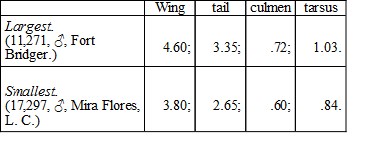 Birds of this species breeding south of the Rio Grande, as well as those from Cape St. Lucas, Mazatlan, etc., are very much smaller than those nesting within the United States; but the transition between the extremes of size is so gradual that it is almost impossible to strike an average of characters for two races. The extremes of size in this species are as follows:—