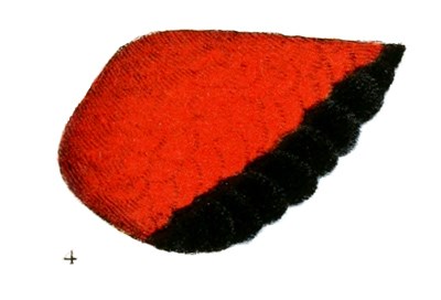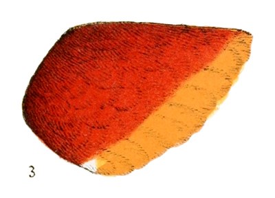 Middle wing-coverts wholly white in maleB. tricolor. Tail square. Red of the shoulders a brownish-scarlet, or burnt-carmine tint. Black of the plumage (both sexes at all ages) with a silky bluish lustre. Female with wing-coverts edged with pure white.