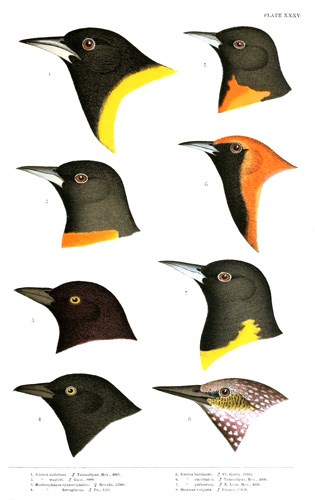 Icterus vulgaris, DaudinTROUPIALOriolus icterus, Linn. Syst. Nat. I, 1766, 161. Icterus vulgaris, “Daudin.”—Aud. Birds Am. VII, 1844, 357, pl. ccccxcix.—Bp. Conspectus Av. 1850, 434.—Baird, Birds N. Am. 1858, 542.—Cass. P. A. N. S. 1867, 46. Le troupiale vulgaire, Buffon, Pl. enl. “532” (535, Bp.).