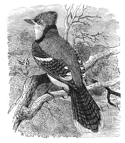 Cyanura cristata, SwainsonBLUE JAYCorvus cristatus, Linn. Syst. Nat. I, (10th ed.,) 1758, 106; (12th ed.,) 1766, 157.—Gmelin, Syst. Nat. I, 1788, 369.—Wilson, Am. Orn. I, 1808, 2, pl. I, f. 1.—Bon. Obs. Wilson, 1824, No. 41.—Doughty, Cab. N. H. II, 1832, 62, pl. vi.—Aud. Orn. Biog. II, 1834, 11; V, 1839, 475, pl. cii. Garrulus cristatus, “Vieillot, Encyclop. 890.”—Ib. Dict. XI, 477.—Bon. Syn. 1828, 58.—Sw. F. Bor.-Am. II, 1831, 293.—Vieillot, Galerie, I, 1824, 160, pl. cii.—Aud. Birds Am. IV, 110, pl. ccxxxi.—Max. Caban. J. 1858, VI, 192. Pica cristata, Wagler, Syst. Av. 1827, Pica, No. 8. Cyanurus cristatus, Swainson, F. Bor.-Am. II, 1831, App. 495.—Baird, Birds N. Am. 1858, 580.—Samuels, 364.—Allen, B. E. Fla. 297. Cyanocorax cristatus, Bon. List, 1838. Cyanocitta cristata, Strickland, Ann. Mag. N. H. 1845, 261.—Cabanis, Mus. Hein. 1851, 221. Cyanogarrulus cristatus, Bon. Consp. 1850, 376.