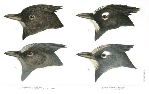 The different varieties just indicated under Cyanura stelleri, namely, stelleri, frontalis, macrolopha, diademata, and coronata, all appear to represent well-marked and easily defined races of one primitive species, the gradation from one form to the other being very regular, and agreeing with the general variation attendant upon geographical distribution. Thus, beginning with C. stelleri, we have the anterior part of head and body, including interscapular region, black, without any markings on the head. In frontalis the back is lighter, and a glossy blue shows on the forehead. In macrolopha the blue of posterior parts invades the anterior, tingeing them very decidedly, leaving the head black, with a blue shade to the crest; the forehead is glossed with bluish-white; the upper eyelids have a white spot. In coronata the blue tinge is deeper, and pervades the entire body, except the side of the head. The shade of blue is different from macrolopha, and more like that of stelleri; diademata, intermediate in habitat between macrolopha and coronata, is also intermediate in colors. The tail becomes rather more even, and the bill more slender, as we proceed from stelleri to coronata. The bars on the secondary coverts become darker in the same progression.