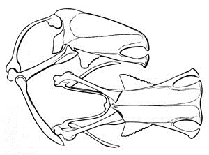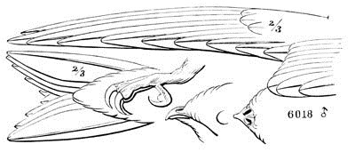 The Cypselidæ, or Swifts, are Swallow-like birds, generally of rather dull plumage and medium size. They were formerly associated with the true Swallows on account of their small, deeply cleft bill, wide gape, short feet, and long wings, but are very different in all the essentials of structure, belonging, indeed, to a different order or suborder. The bill is much smaller and shorter; the edges greatly inflected; the nostrils superior, instead of lateral, and without bristles. The wing is more falcate, with ten primaries instead of nine. The tail has ten feathers instead of twelve. The feet are weaker, without distinct scutellæ; the hind toe is more or less versatile, the anterior toes frequently lack the normal number of joints, and there are other features which clearly justify the wide separation here given, especially the difference in the vocal organs. Strange as the statement may be, their nearest relatives are the Trochilidæ, or Humming-Birds, notwithstanding the bills of the two are as opposite in shape as can readily be conceived. The sternum of the Cypselidæ is also very different from that of the Hirundinidæ, as will be shown by the accompanying figure. There are no emarginations or openings in the posterior edge, which is regularly curved. The keel rises high, for the attachment of the powerful pectoral muscles. The manubrium is almost entirely wanting.