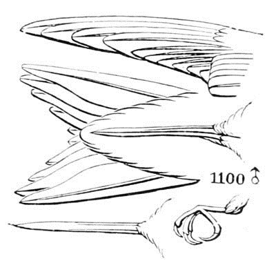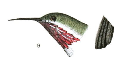 A peculiarity is observable in the wing of the two species of Trochilus as restricted, especially in T. colubris, which we have not noticed in other North American genera. The outer four primaries are of the usual shape, and diminish gradually in size; the remaining six, however, are abruptly much smaller, more linear, and nearly equal in width (about that of inner web of the fourth), so that the interval between the fifth and fourth is from two to five times as great as that between the fifth and sixth. The inner web of these reduced primaries is also emarginated at the end. This character is even sometimes seen in the females, but to a less extent, and may serve to distinguish both colubris and alexandri from other allied species where other marks are obscured.