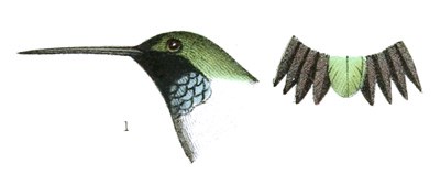 Gen. Char. Metallic gorget of throat nearly even all round. Tail forked; the feathers lanceolate, acute, becoming gradually narrower from the central to the exterior. Inner six primaries abruptly and considerably smaller than the outer four, with the inner web notched at the end.