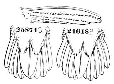 The male bird is very pugnacious, and was observed to attack and drive away an Accipiter fuscus, the Hawk retreating as rapidly as possible. When the nest is approached, the male often rises high into the air and then sweeps down almost to the head of the intruder, its swift descent being accompanied by a very peculiar shrill, screeching buzz, of an extraordinary degree of loudness to be produced by so small a creature. The same sound Mr. Ridgway noticed when the bird was passing overhead, in a manner not observed in any other species, its horizontal flight being by a peculiar undulating course. The shrill noise made by the male of this species he suggests may be caused by the curious attenuated and stiffened outer primary. He noticed a curious piece of ingenuity in nest-making on the part of this species. The nest in question was fastened upon a dead twig of a small cottonwood-tree; the loosening bark, which probably had separated after the nest was finished, had allowed the nest to turn around so as to hang beneath the branch, thus spilling the eggs upon the ground. The owners, however, built another nest upon the top of the branch, fastening its sides to that of the old one, and making the new nest lighter and less bulky, so that the weight of the older nest kept the other in a permanently upright position.